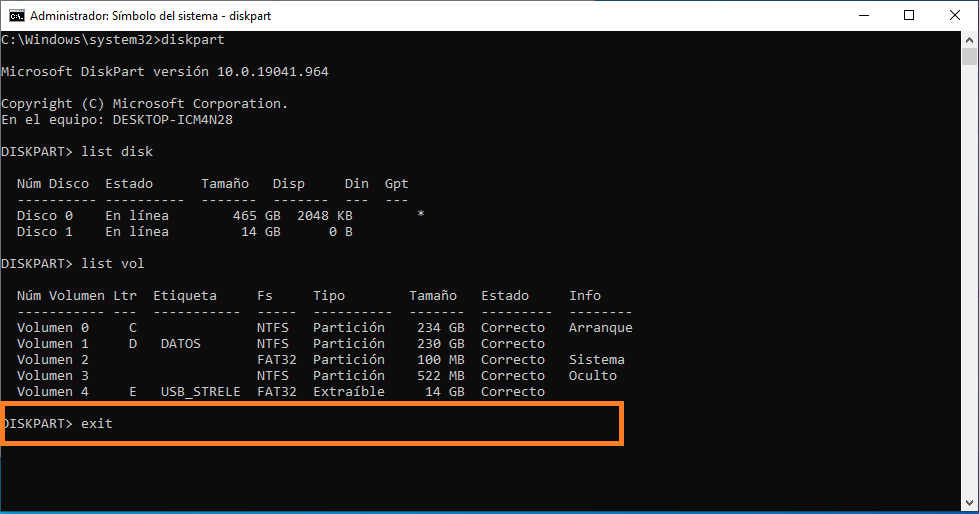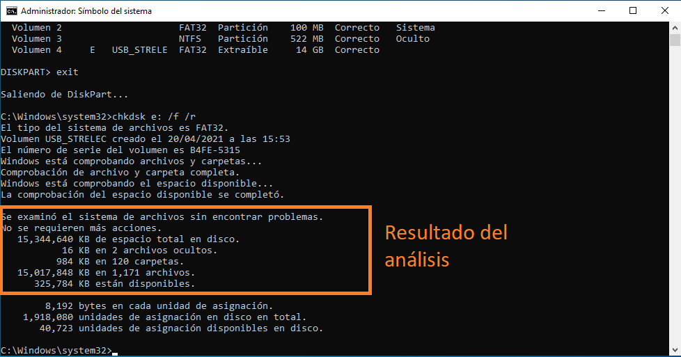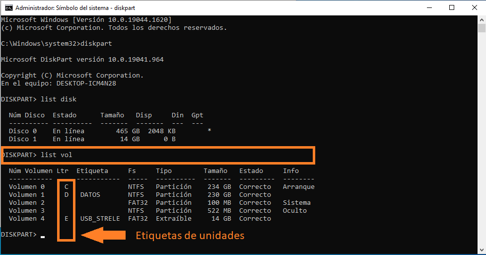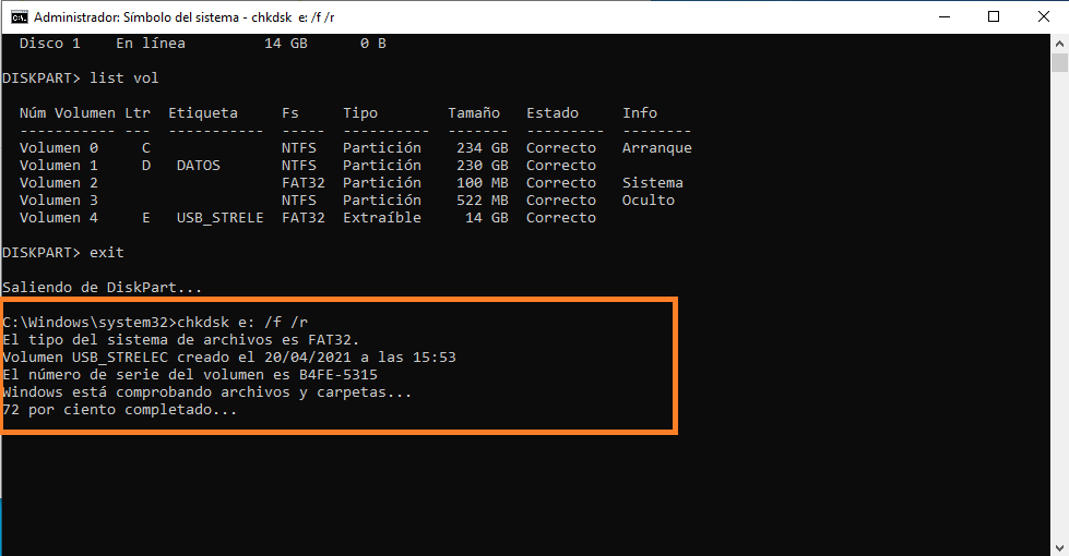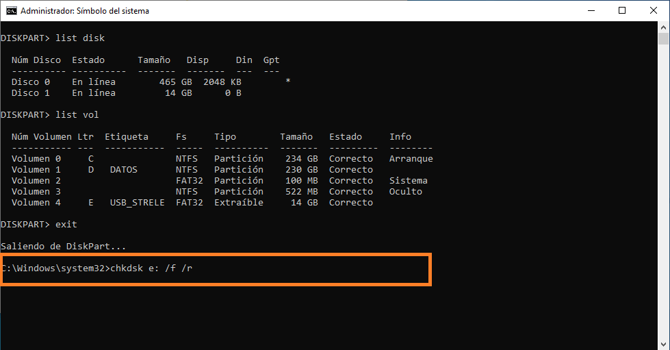 Ahora escribimos el comando “list vol” para verificar la etiqueta de las unidades, verificamos la etiqueta correspondiente a la unidad que deseamos reparar (para este ejemplo utilizaremos la unidad con etiqueta E), por último, salimos del diskpart con el comando «exit» y presionamos enter.