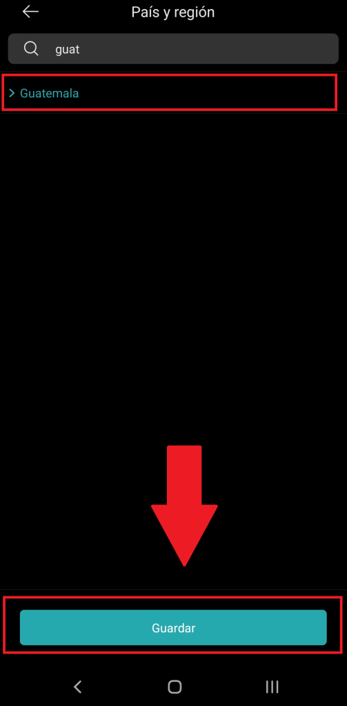 - Ahora seleccionamos nuestro país, en este caso es “Guatemala” y guardamos.