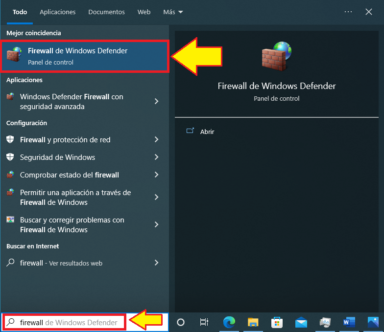 Debemos confirmar que la configuración del firewall esté siendo administrada por Kaspersky Internet Security, para ello colocamos la palabra “Firewall” en el apartado de búsqueda de la barra de tareas y luego damos Clic en el resultado “Firewall de Windows Defender”