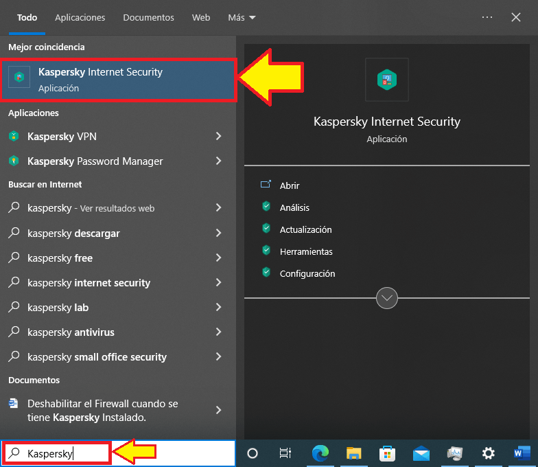 Ahora colocamos la palabra “Kaspersky” en el apartado de búsqueda de la barra de tareas y luego damos clic en el resultado “Kaspersky Internet Security” para acceder a la aplicación.