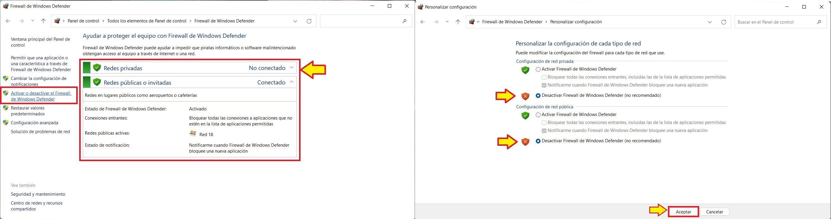 Ahora realizamos el Paso #1 y podremos ver que ya tenemos habilitadas las características y desde aquí accedemos a la opción “Activar o desactivar Firewall de Windows Defender” y dentro de esta configuración desactivamos el firewall para las redes privadas y públicas.