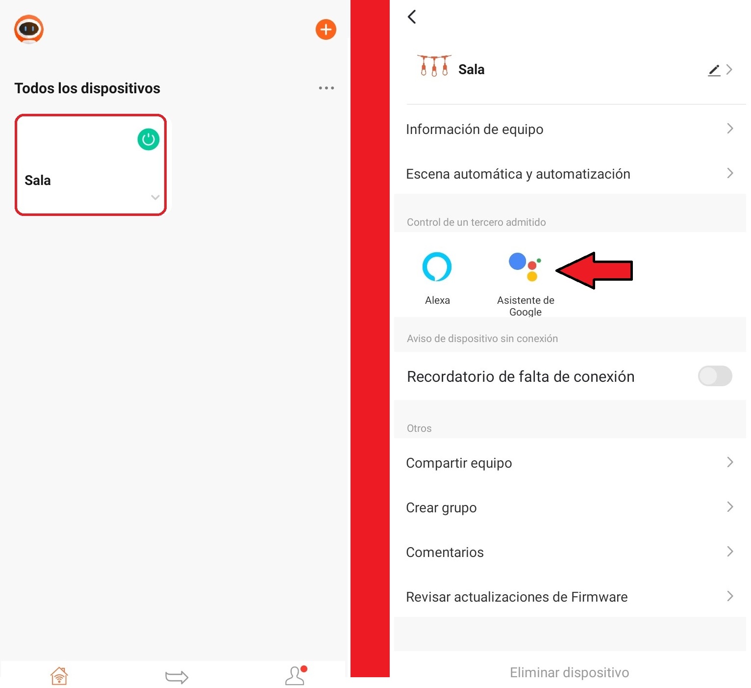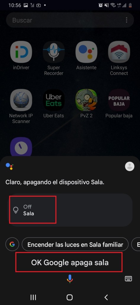 En el menú inicio de nuestro teléfono móvil le indicaremos el comando de voz Google Asisstant que apague nuestro dispositivo vinculado a la aplicación Nexxt Home. Ejemplo (Okey Google apaga Sala), tendremos que llamar a nuestro dispositivo por el nombre asignado en la aplicación Nexxt Home.