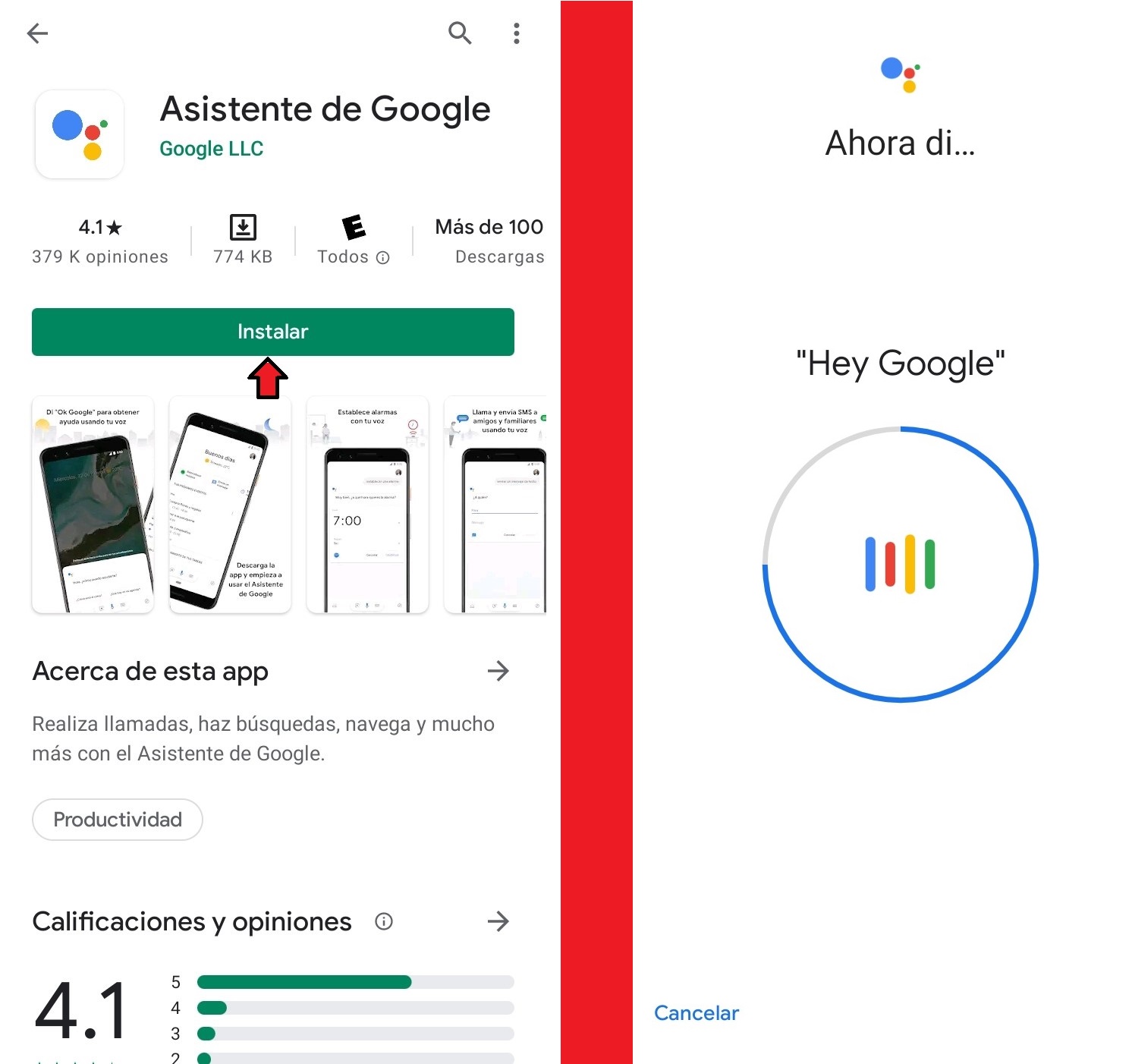 Ingresamos a la Play Store y descargamos la aplicación «Asistente de Google«, al finalizar la descarga ingresamos a la aplicación realizamos la configuración de comando de voz.