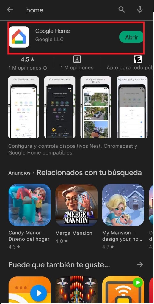 A continuación, ingresamos a la Play Store y descargamos la aplicación «Google Home«.
