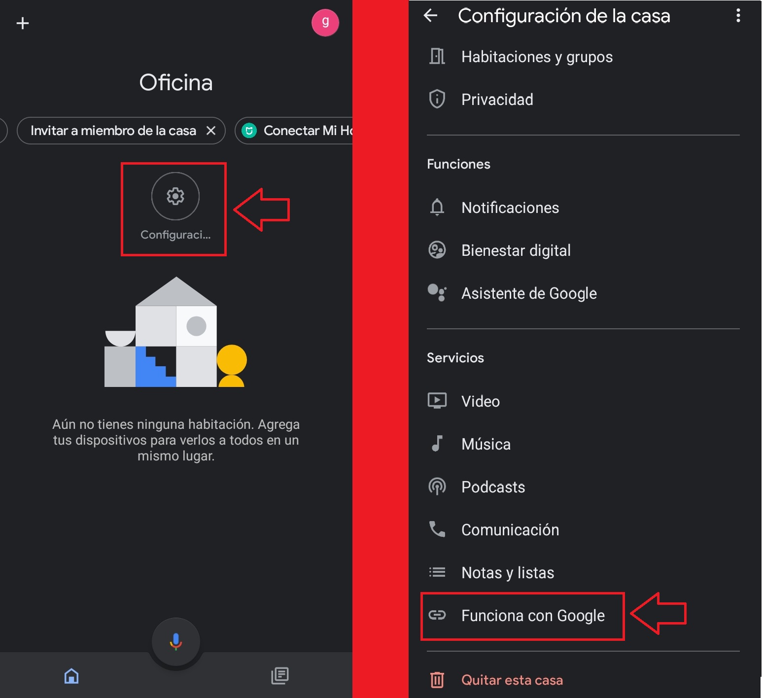 Ingresamos la aplicación Google Home y en el menú inicio seleccionamos la opción de «Configuración» y posterior la opción «Funciona con Google«.