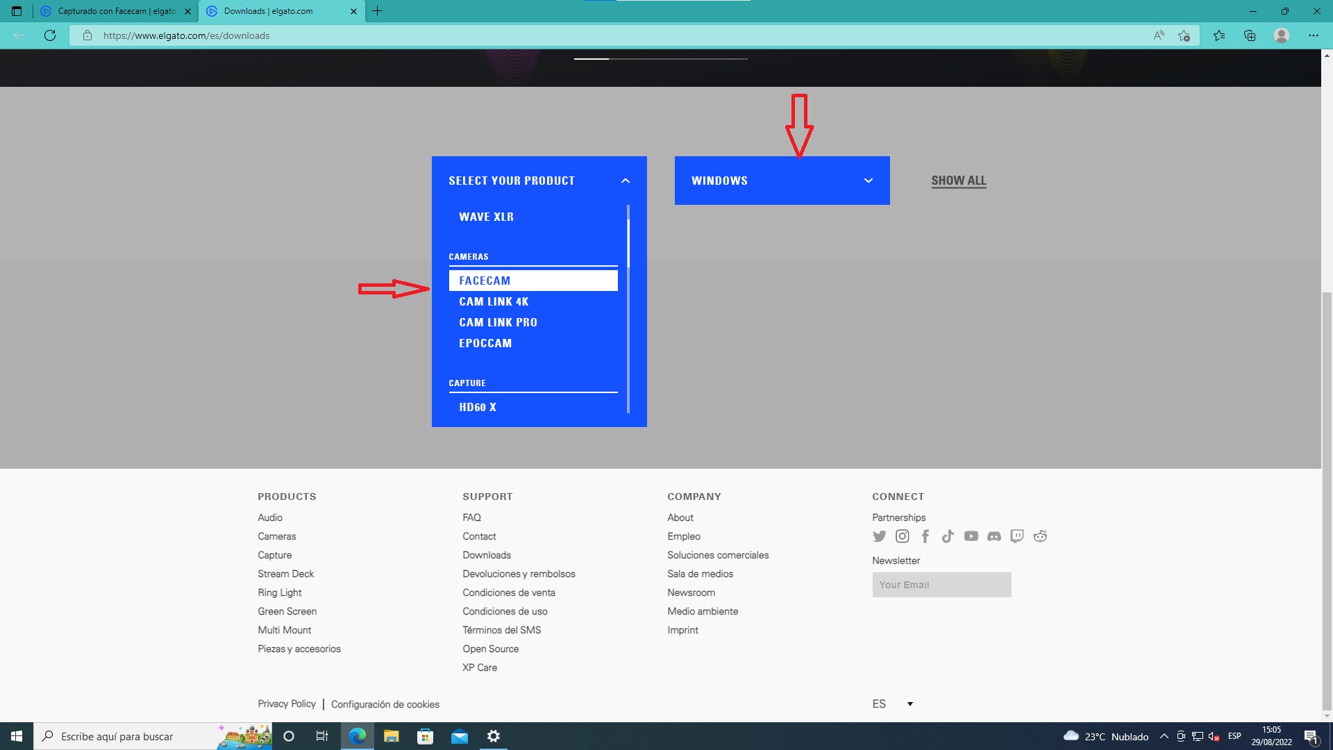 Seleccionar «FACECAM» y en sistema seleccionar «WINDOWS«, seguidamente clic en mostrar todo «Show all«.