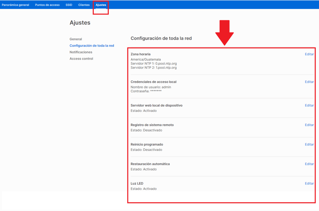 Seleccionamos, la opción “Ajustes” que nos permitirá modificar opciones de funcionamiento como: Credenciales de usuario, reinicio programado, restauración automática, estado de luz, led, entre otras opciones.