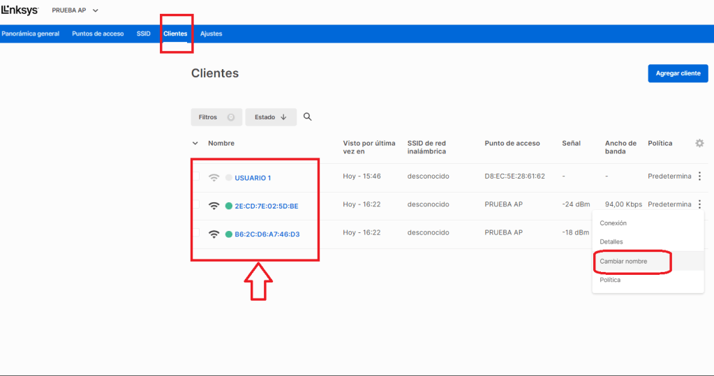 Al presionar, la opción “Clientes” podremos visualizar los dispositivos conectados a nuestro Linksys Cloud Managed AC1300 Access Point WiFi Exterior LAPAC1300CE y en caso de querer renombrar cada dispositivo a la opción “Ajustes” y seleccionamos “Cambiar Nombre”.