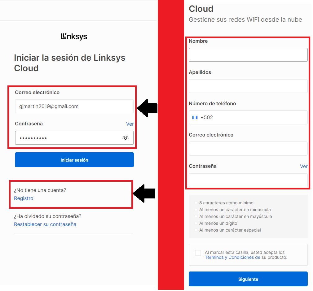 Iniciamos sesión en «Linksys Cloud» con una cuenta ya registrada. (De no contar con una cuenta tendremos que crear una).