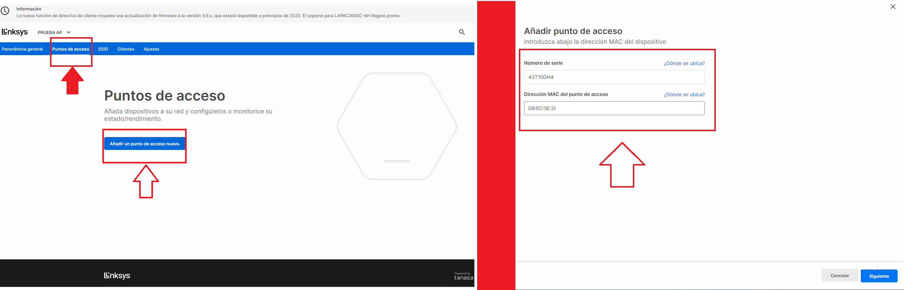 Seleccionamos la opción “Punto de Acceso” y posterior “Añadir un punto nuevo de acceso”, ingresamos número de serie y dirección MAC, las cuales se ubican en la parte inferior de nuestro Linksys Cloud Managed AC1300 Access Point WiFi Exterior LAPAC1300CE a configurar.