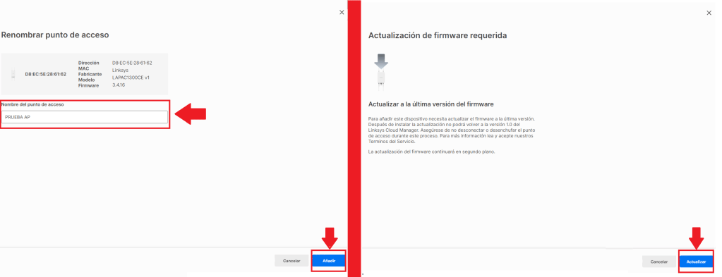 A continuación, renombramos nuestro punto de acceso (el nombre podrá ser a nuestra elección), presionamos «Añadir» y posterior nos solicitará que actualicemos a la última versión de firmware.