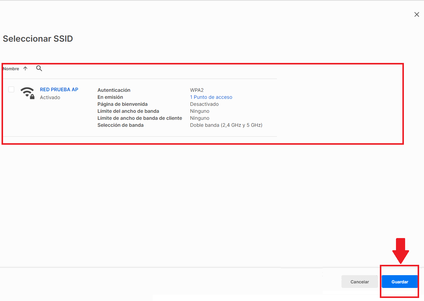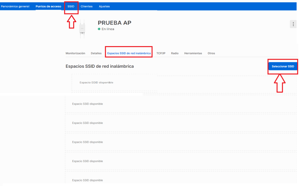 Seleccionamos la opción “SSID” (opción que nos permitirá agregar a una red nuestro Linksys Cloud Managed AC1300 Access Point WiFi Exterior LAPAC1300CE) y seleccionamos la opción “Seleccionar SSID”.