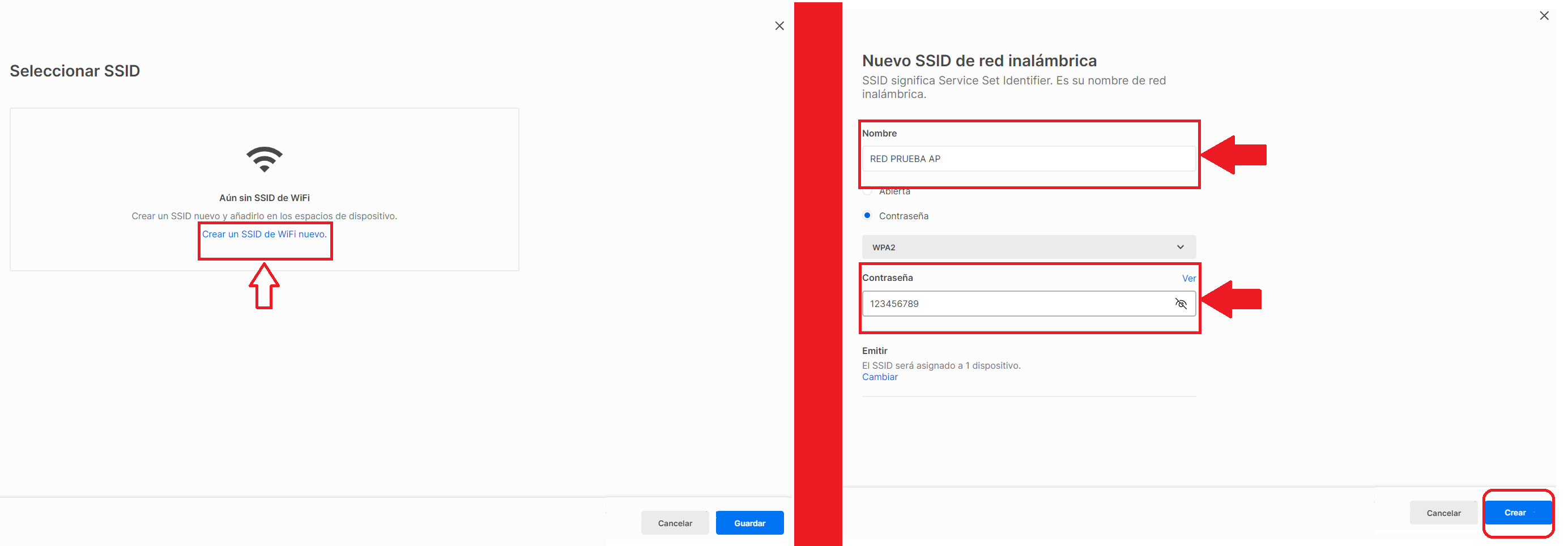 Presionamos la opción “Crear un SSID de Wifi Nuevo” y nos desplegará una ventana donde colocaremos el nombre y contraseña que deseamos asignar a nuestra red a crear en nuestro Linksys Cloud Managed AC1300 Access Point WiFi Exterior LAPAC1300CE.