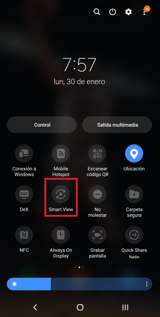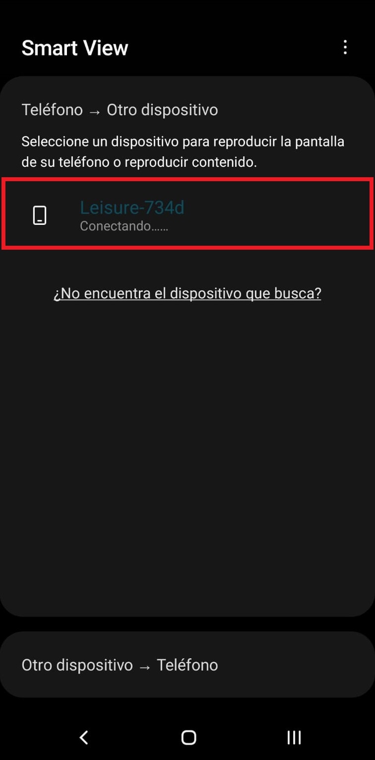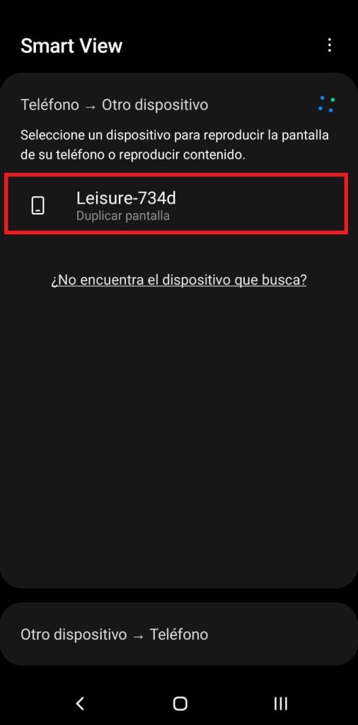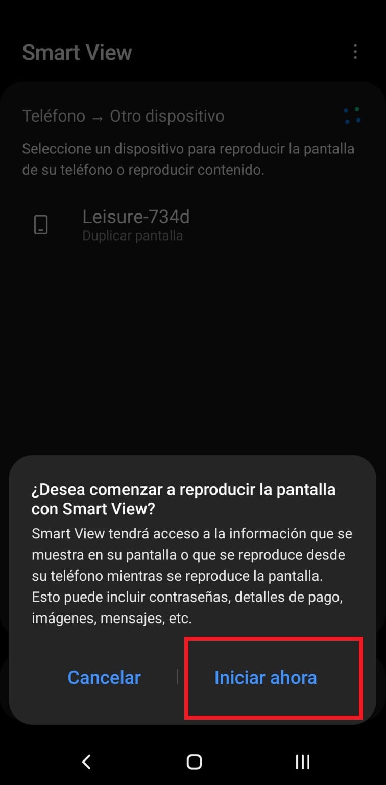 Ahora desde nuestro dispositivo móvil elegimos la opción “Smart View”, nos mostrará los dispositivos disponibles para vincularnos, seleccionamos “Leisure-734d”, iniciará el proceso de vinculación, cuando finalice seleccionamos la opción de “Iniciar ahora”.