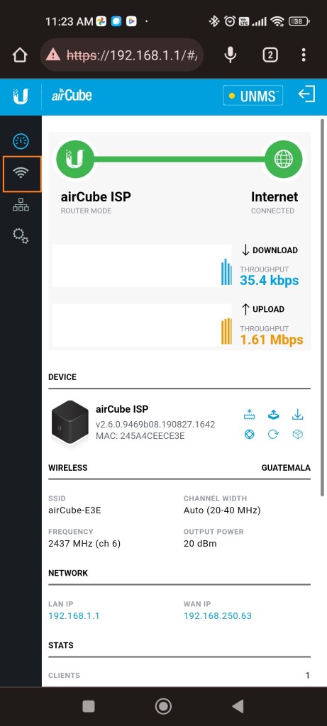 Una vez conectados nos dirigimos a nuestro navegador y colocamos la IP: 192.168.1.1 para ingresar a las configuraciones de nuestro UBIQUITI ACB-ISP UISP AIR CUBE ISP ACCESS POINT NEGRO.