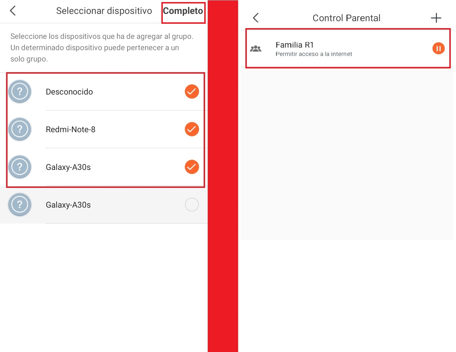 Seleccionamos los dispositivos que deseamos agregar a nuestro grupo de control parental y completamos el proceso.