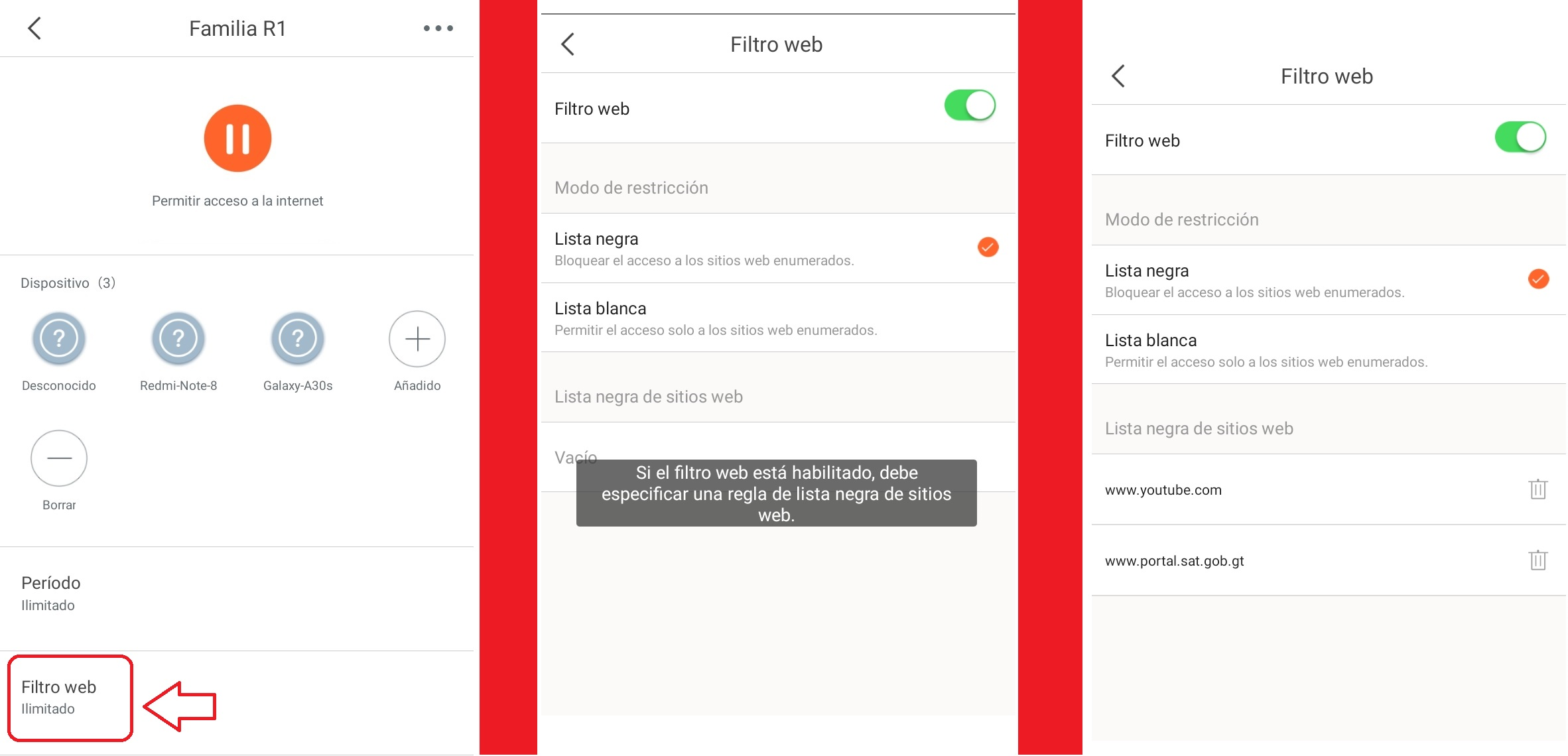 Adicional, en el menú de «Filtro Web» podremos agregar a la «Lista negra» las páginas web que no deseamos que nuestro grupo de control parental tenga acceso o también podremos habilitar la opción de «Lista Blanca» que serán las únicas páginas web que nuestro grupo tendrá acceso a ellas.