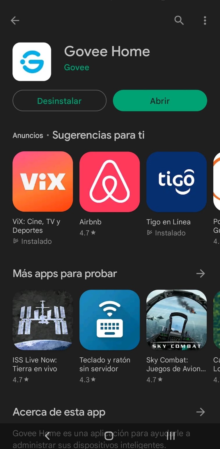 Ya teniendo armada completamente nuestra lámpara de pared, en nuestro dispositivo móvil descargamos la aplicación de “Govee Home” para poder vincular y configurar los colores y patrones que deseemos, cuando finalice la instalación la ejecutamos.