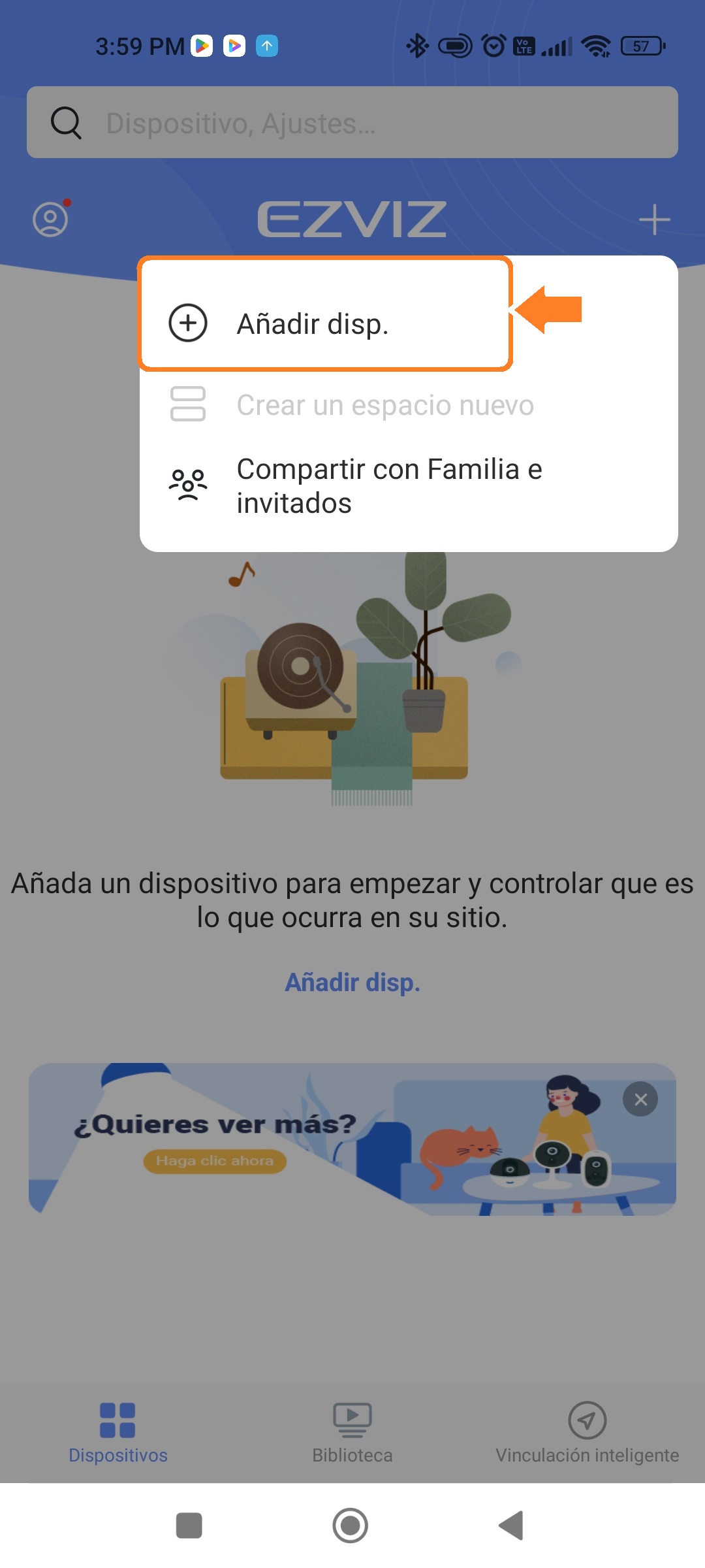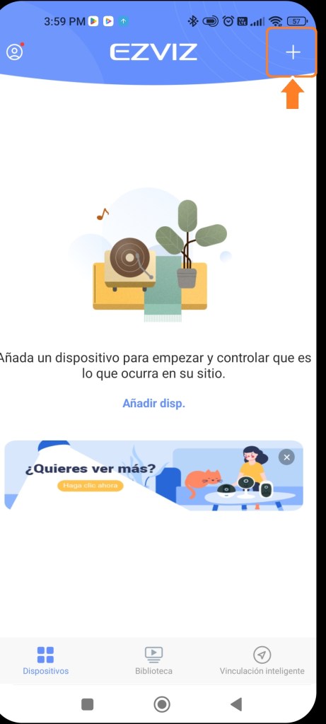 En nuestra tienda de aplicaciones descargamos e instalamos la aplicación «EZVIZ «, al tenerla instalada la ejecutamos y añadimos un nuevo dispositivo.