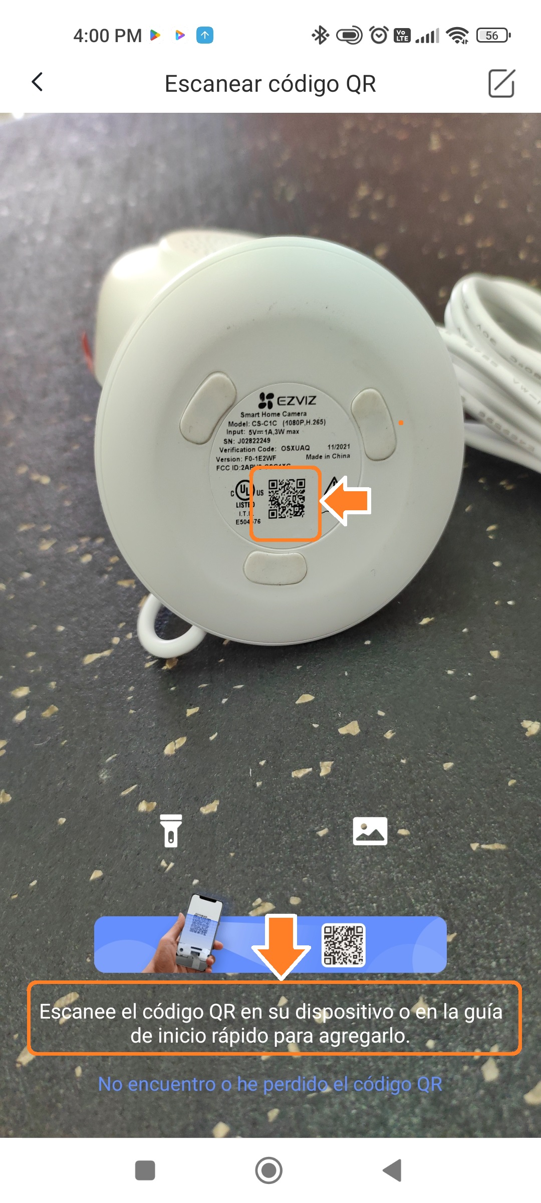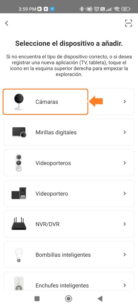 Al añadir un nuevo dispositivo seleccionamos la opción de «Cámara«. Escaneamos con nuestro dispositivo móvil el código QR que se encuentra en la parte inferior de nuestra cámara.
