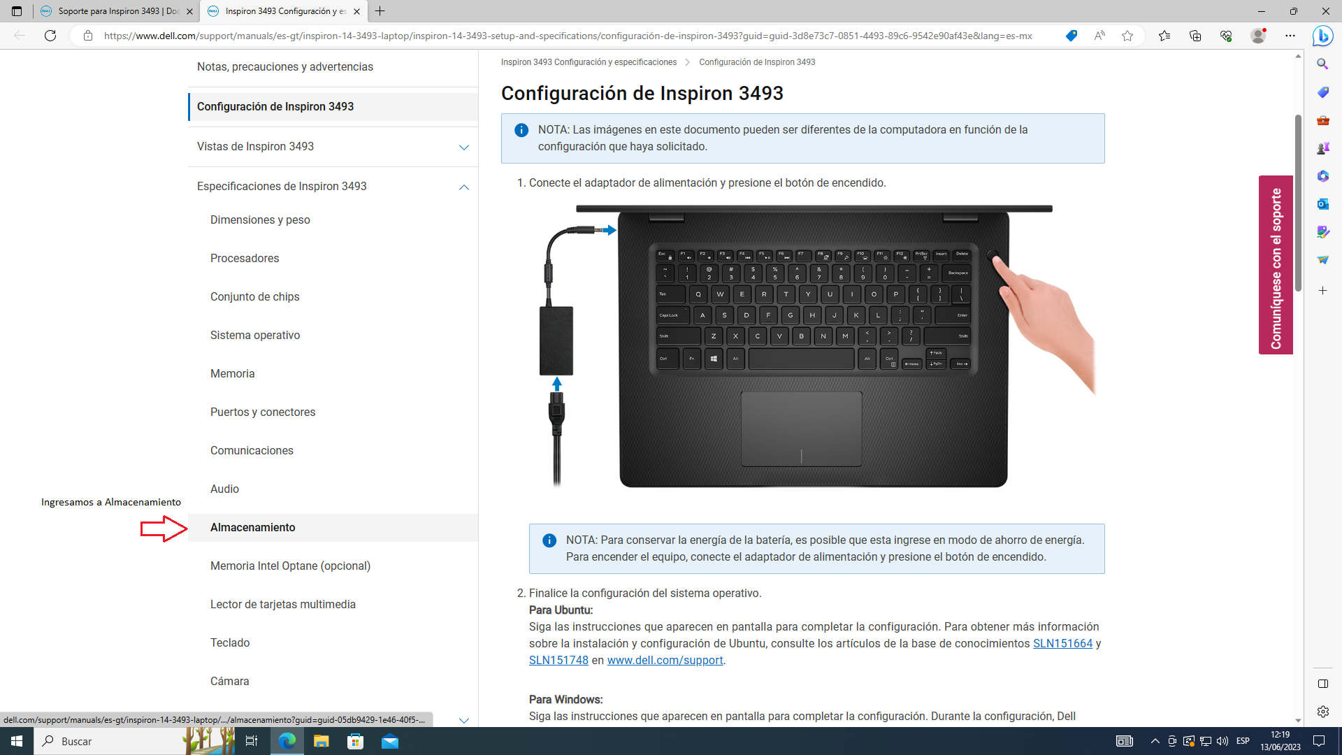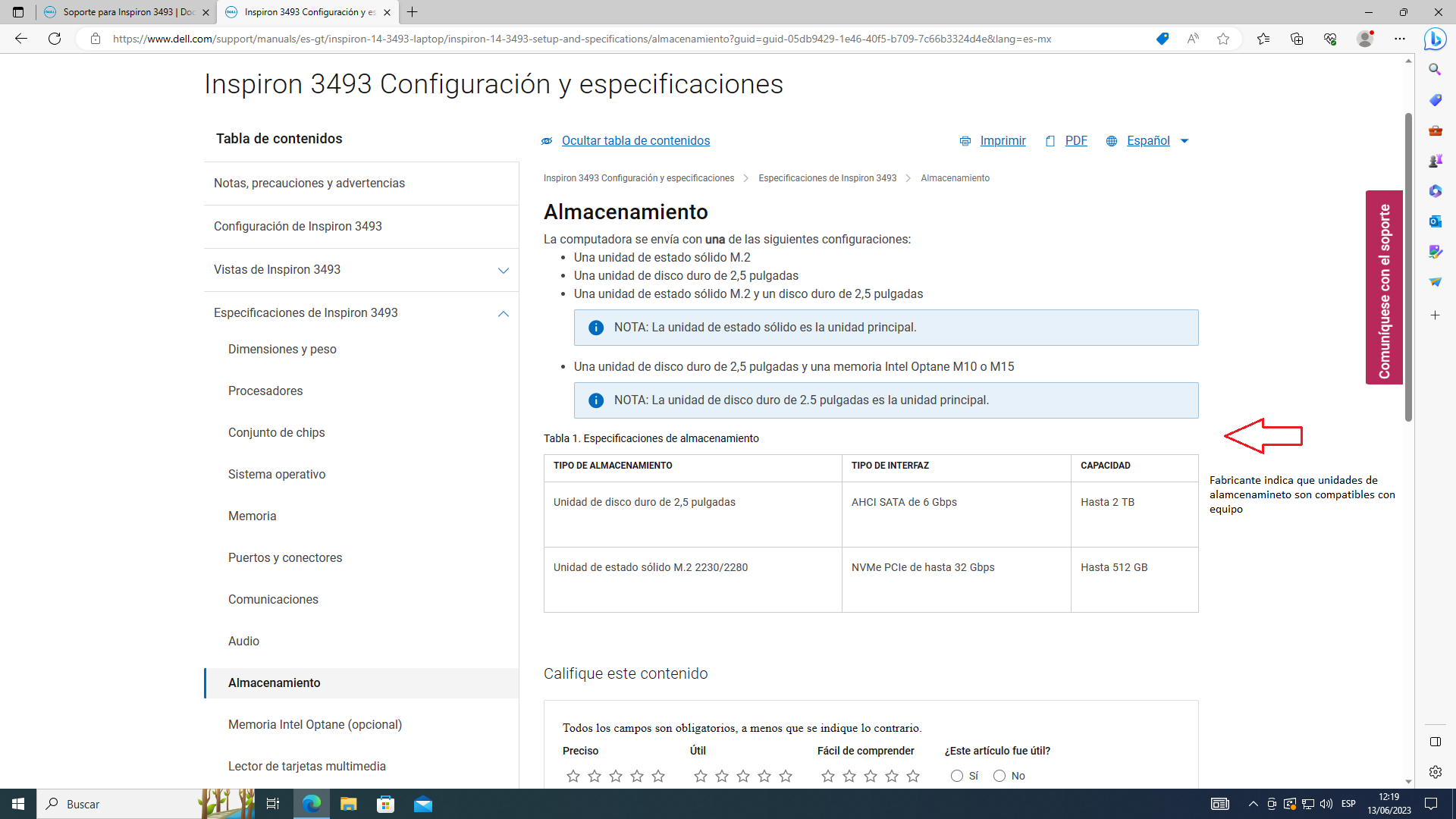 Paso #6: Luego ingresamos a Especificaciones y buscamos “Almacenamiento” donde nos mostrara que tipo de almacenamiento utiliza el equipo y con cual SSD es compatible.