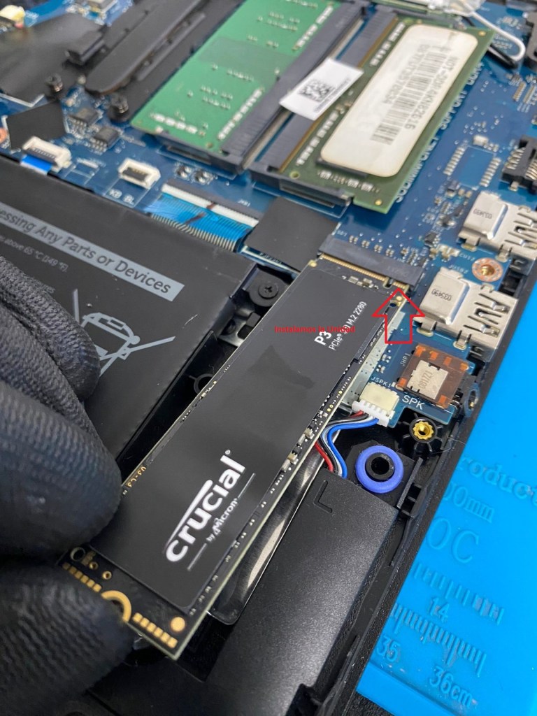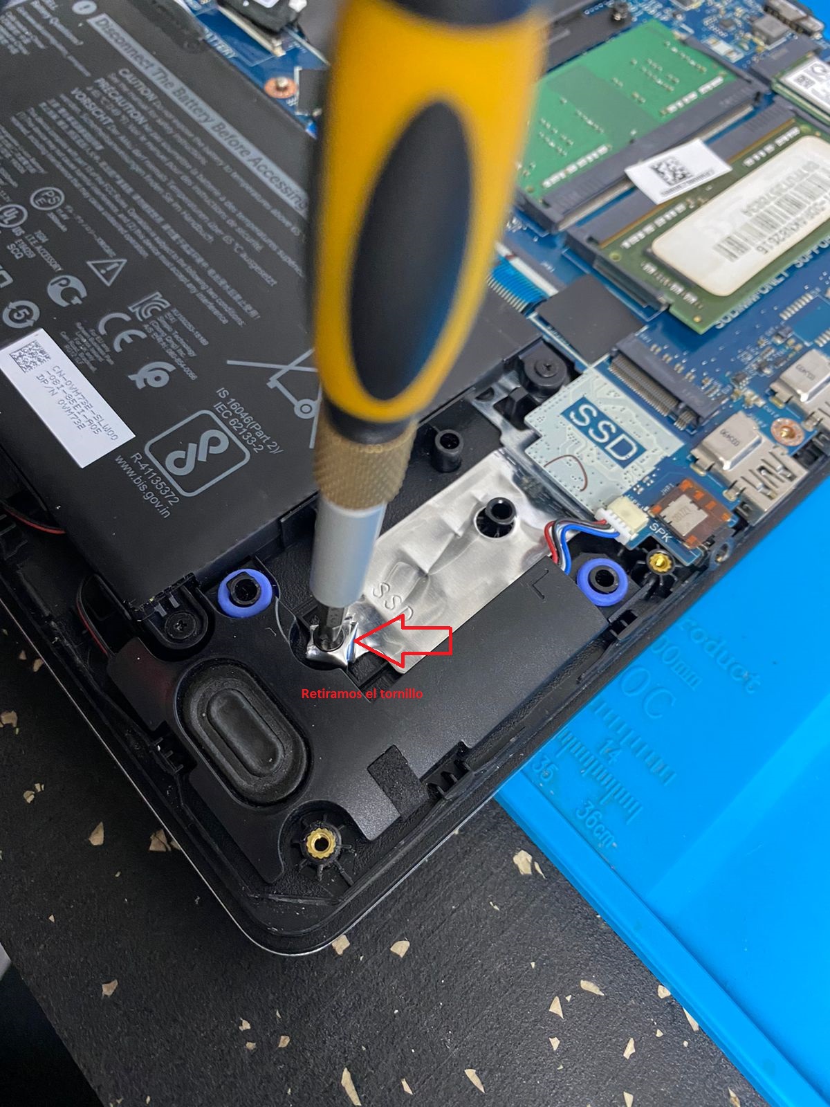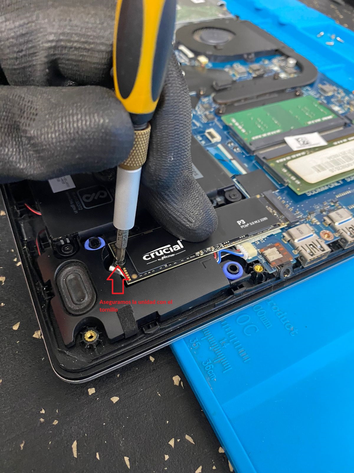 Paso #9: Localizamos el puerto para nuestro SSD, retiramos el tonillo y lo instalamos, colocamos el tornillo para asegurarlo a la placa base.