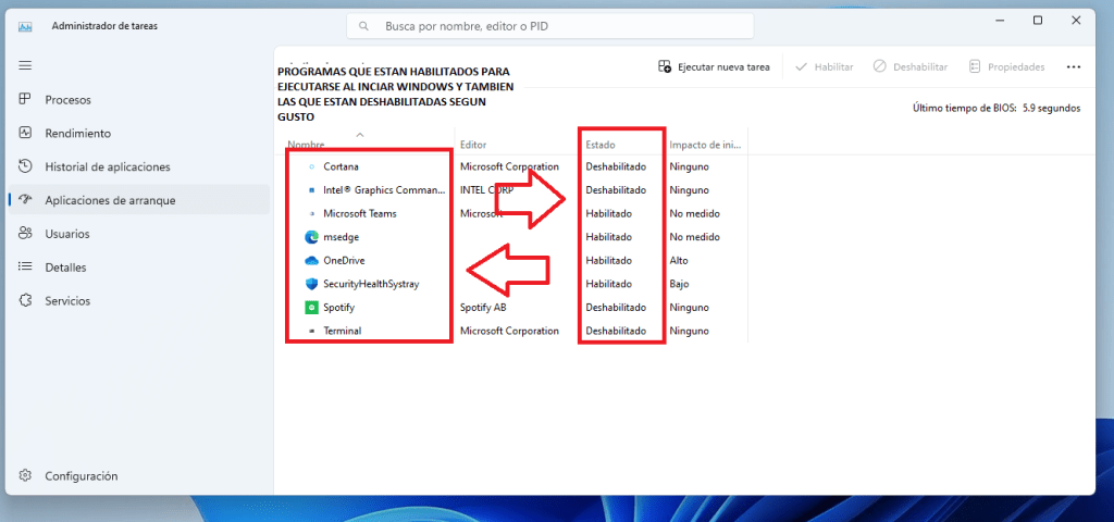 Ubicamos la aplicación que queremos deshabilitar para que se inicie automáticamente, en nuestro caso será la de (msedge) y colocamos el cursor sobre el mismo