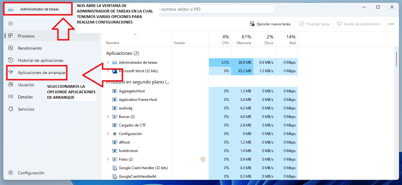 Ya teniendo abierta esta ventana vamos a realizar la búsqueda del apartado: Aplicaciones de arranque. Y damos click izquierdo sobre el mismo.