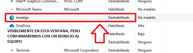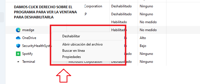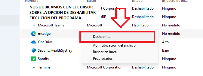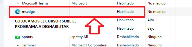 Ubicamos la aplicación que queremos deshabilitar para que se inicie automáticamente, en nuestro caso será la de (msedge) y colocamos el cursor sobre el mismo