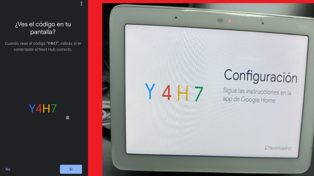 La aplicación Google Home nos preguntara si visualizamos en la pantalla de nuestra Bocina Google el código de vinculación y seleccionamos “si”.