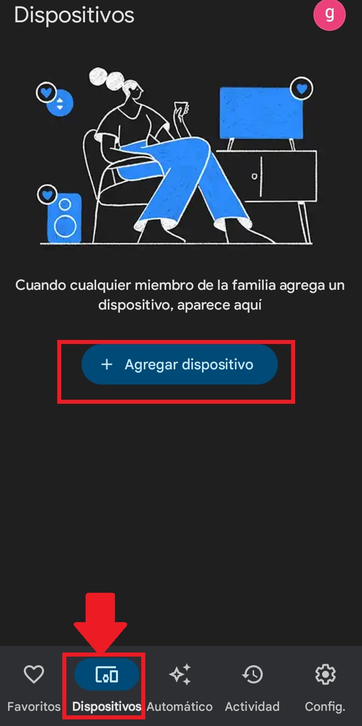 Abrimos la aplicación Google Home, seleccionamos el menú “dispositivos” y posterior agregar un nuevo dispositivo.