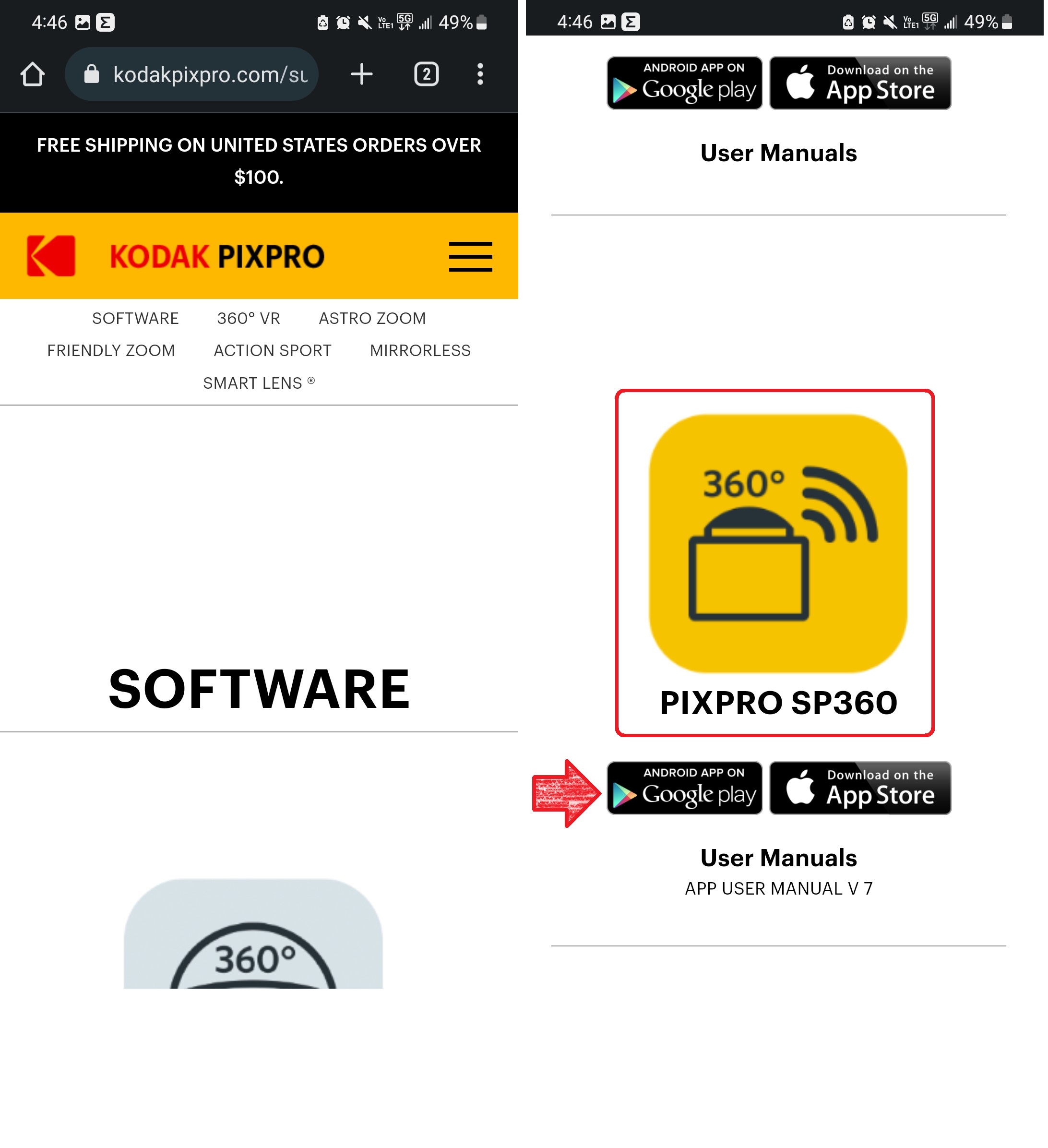 Nos dirigirá a la página oficial de kodak, buscaremos el apartado para descarga la aplicación de pixpro sp 360 y presionáremos la ventana que nos dirigirá a Google play o app store.