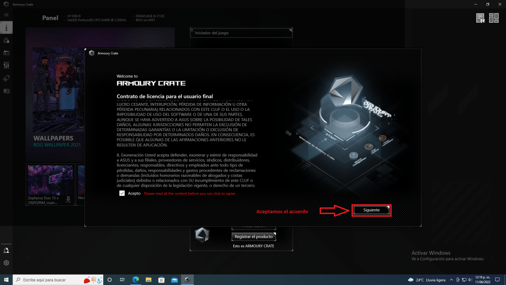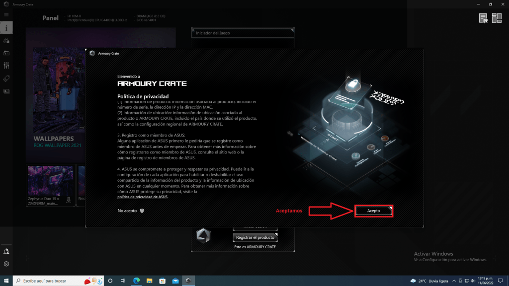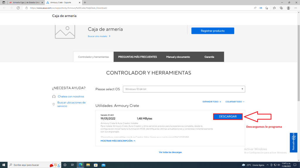 Ingresamos a nuestro navegador y descargamos la aplicación Armoury Crate desde la página oficial de Asus