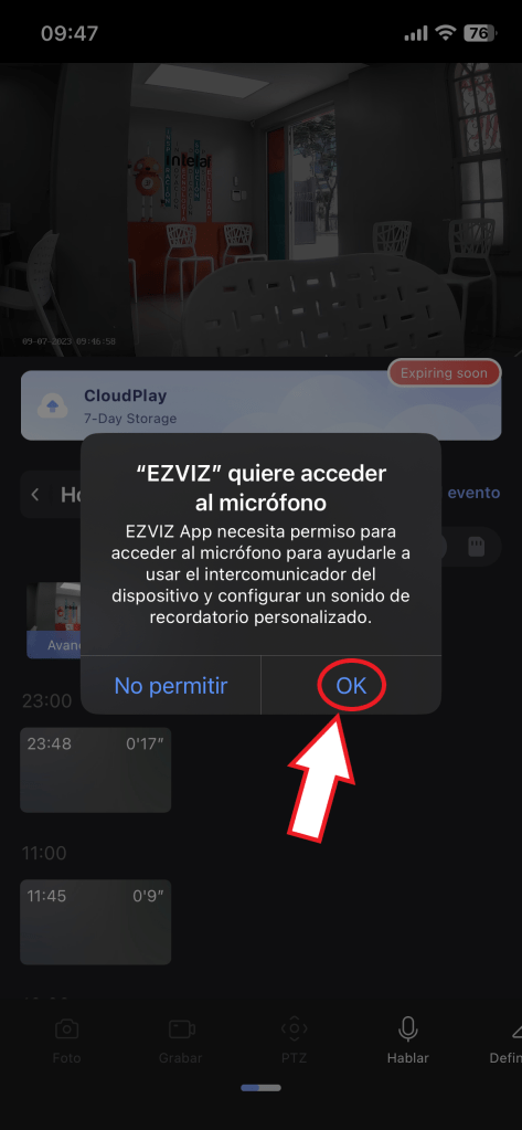 La aplicación “EZVIZ”, nos pedirá permisos para acceder al micrófono de nuestro celular, para poder así ayudarnos a poder utilizar el intercomunicador del dispositivo.