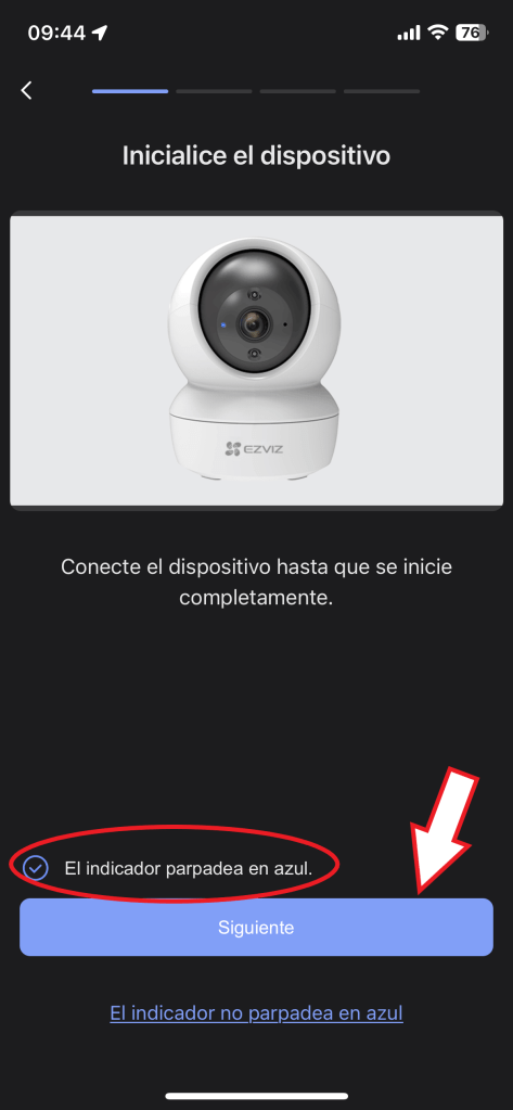 En esta parte la cámara debería estar emitiendo una luz intermitente color Azul y si está emitiendo la luz azul, le damos siguiente en la aplicación