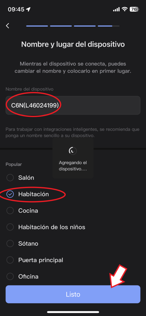 Nos indica la aplicación que podemos colocar un nombre al dispositivo y colocar el sitio dónde lo estaremos colocando para tenerlo como referencia, seleccionamos dependiendo del sitio dónde estemos colocando la cámara y le damos en “Listo”.