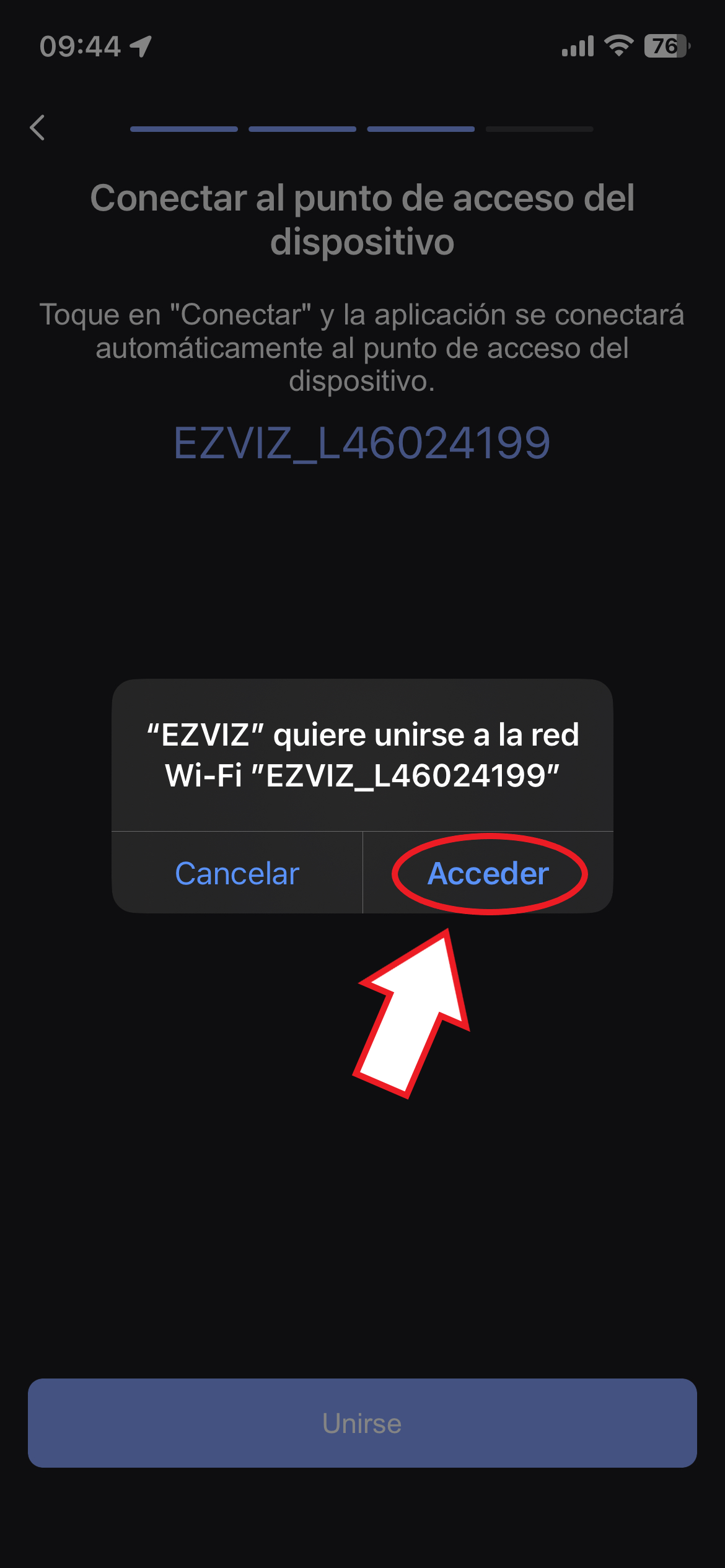 En este paso veremos que la aplicación nos está pidiendo el permiso que se una a la Red Wi-Fi que creó la cámara para poder completar la conexión.