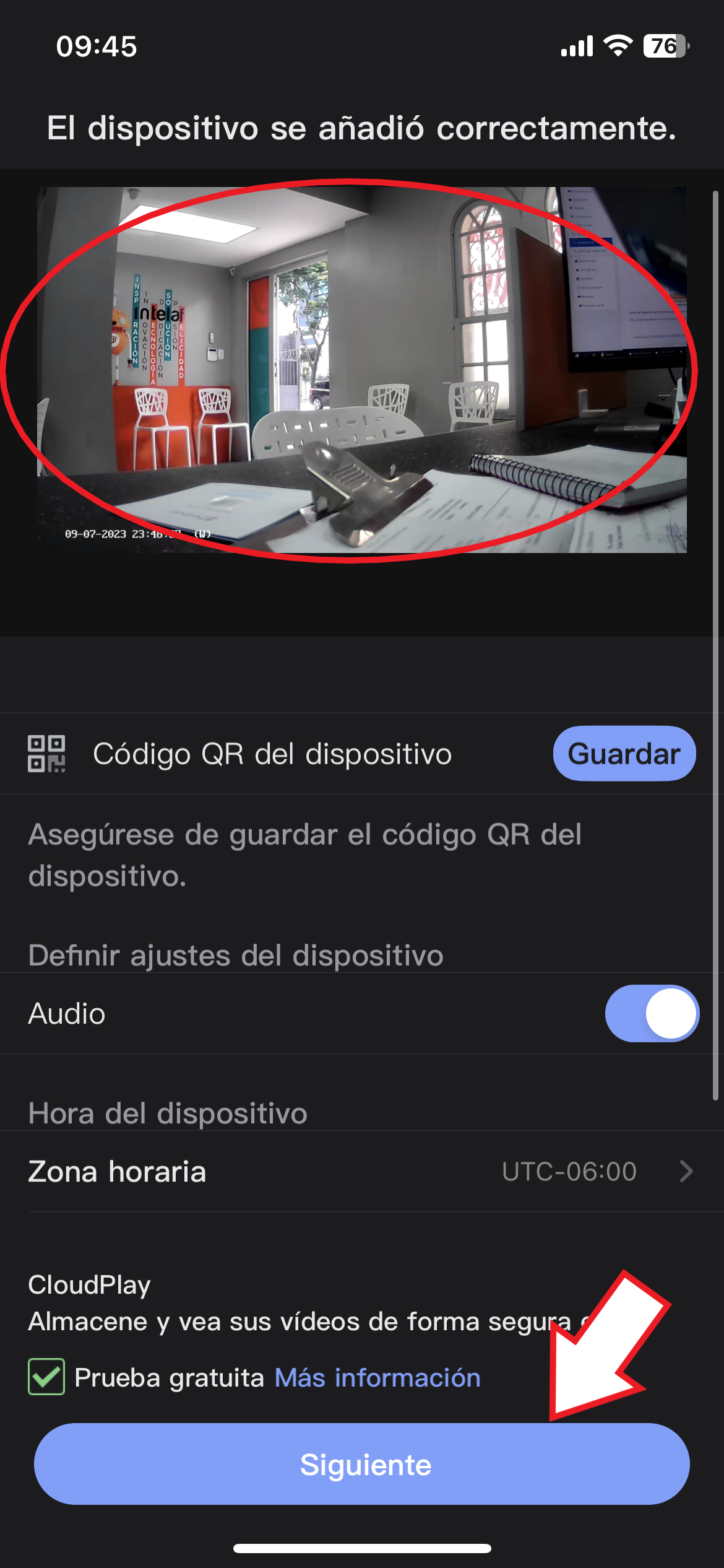Nos indica en la parte superior que “El dispositivo se añadió correctamente”, y nos muestra una previsualización del funcionamiento de la cámara, le damos en “Siguiente”.