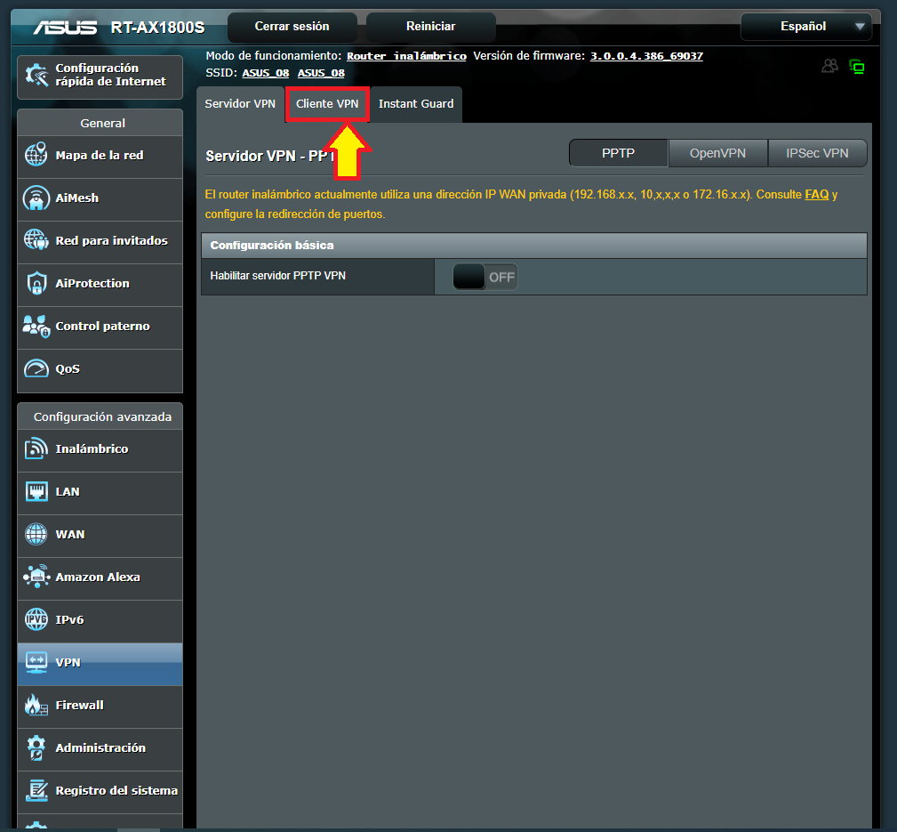 Dentro del apartado de VPN, seleccionamos “Cliente VPN” en la parte superior.
