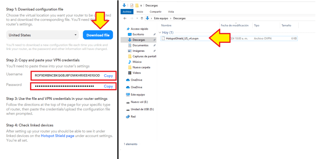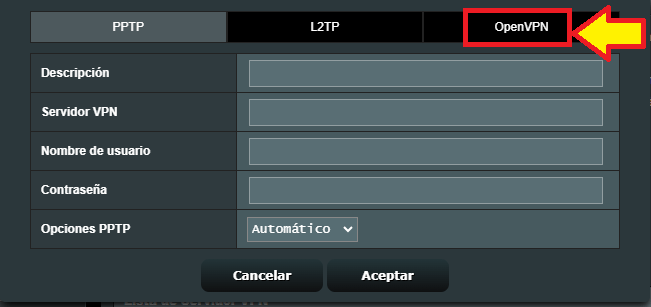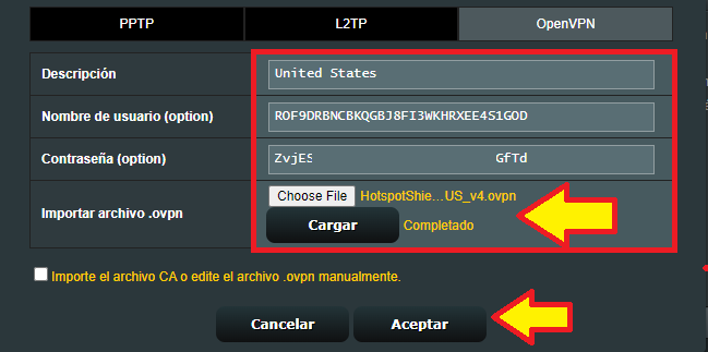 Ahora, regresando al router, en el cuadro que tenemos visible vamos a llenar con los datos proporcionados por el proveedor VPN. En este ejemplo utilizamos los servicios de https://www.hotspotshield.com/
