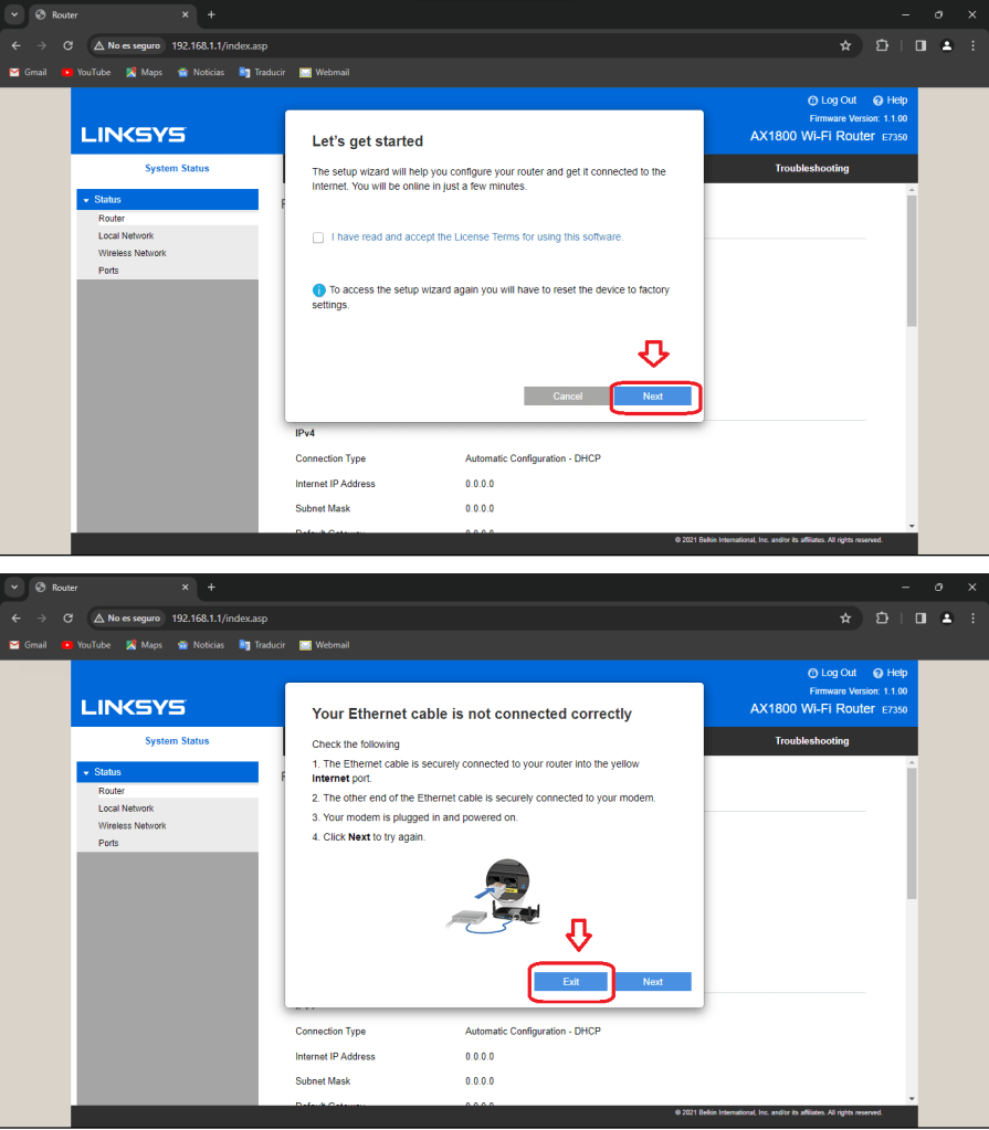 Nos abrirá la página para cunfiguracion del router, la ventana Let´s get started seleccionamos el boton next, nos abrirá otra ventana la cual nos indica que conectemos nuestro router al router principal, en este caso seleccionamos exit.