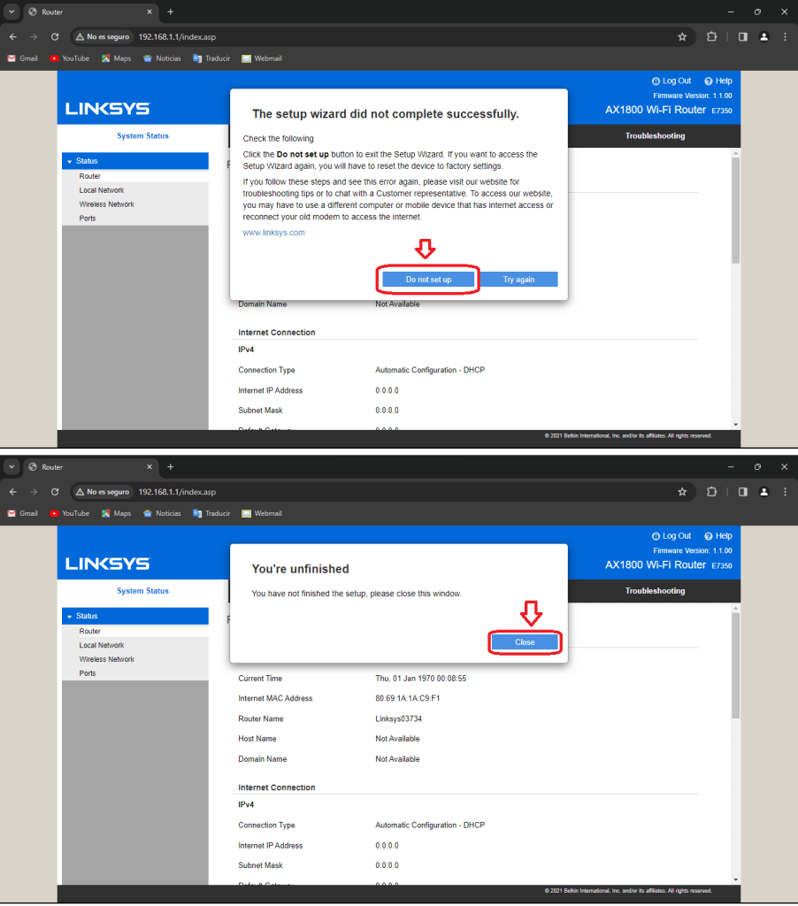 En la siguiente ventana nos mostrara un mensaje el cual nos indica que no se ha configurado correctamente en este caso no se requiere configurar mediante un cable de red por lo que seleccionamos Do not set up y luego close