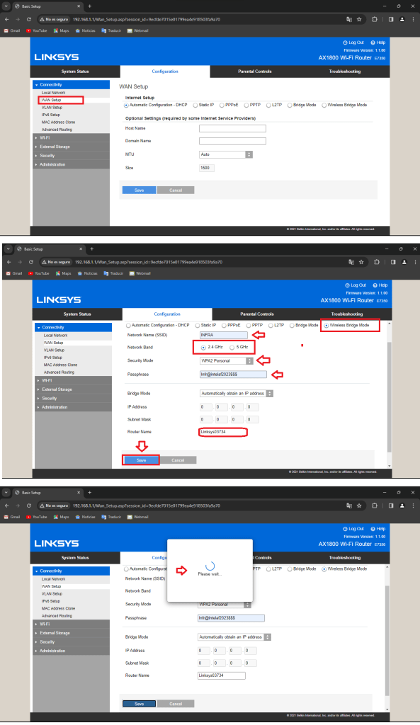 Luego en las pestañas del lado izquierdo desplegamos la pestaña connectivity, y seleccionamos wan setup, luego daremos click en la configuración wireless bridge mode y llenamos lo solicitado, nombres de la red wifi a conectar (SSID), la banda a conectarse, seleccionamos la seguridad de la red y la contraseña, luego de esta daremos en save. Esperaremos asta que se configure correctamente el router.