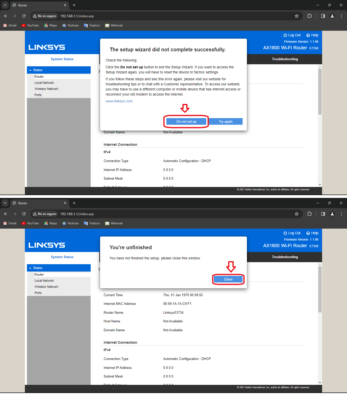 En la siguiente ventana nos mostrara un mensaje el cual nos indica que no se ha configurado correctamente en este caso no se requiere configurar mediante un cable de red por lo que seleccionamos Do not set up y luego close