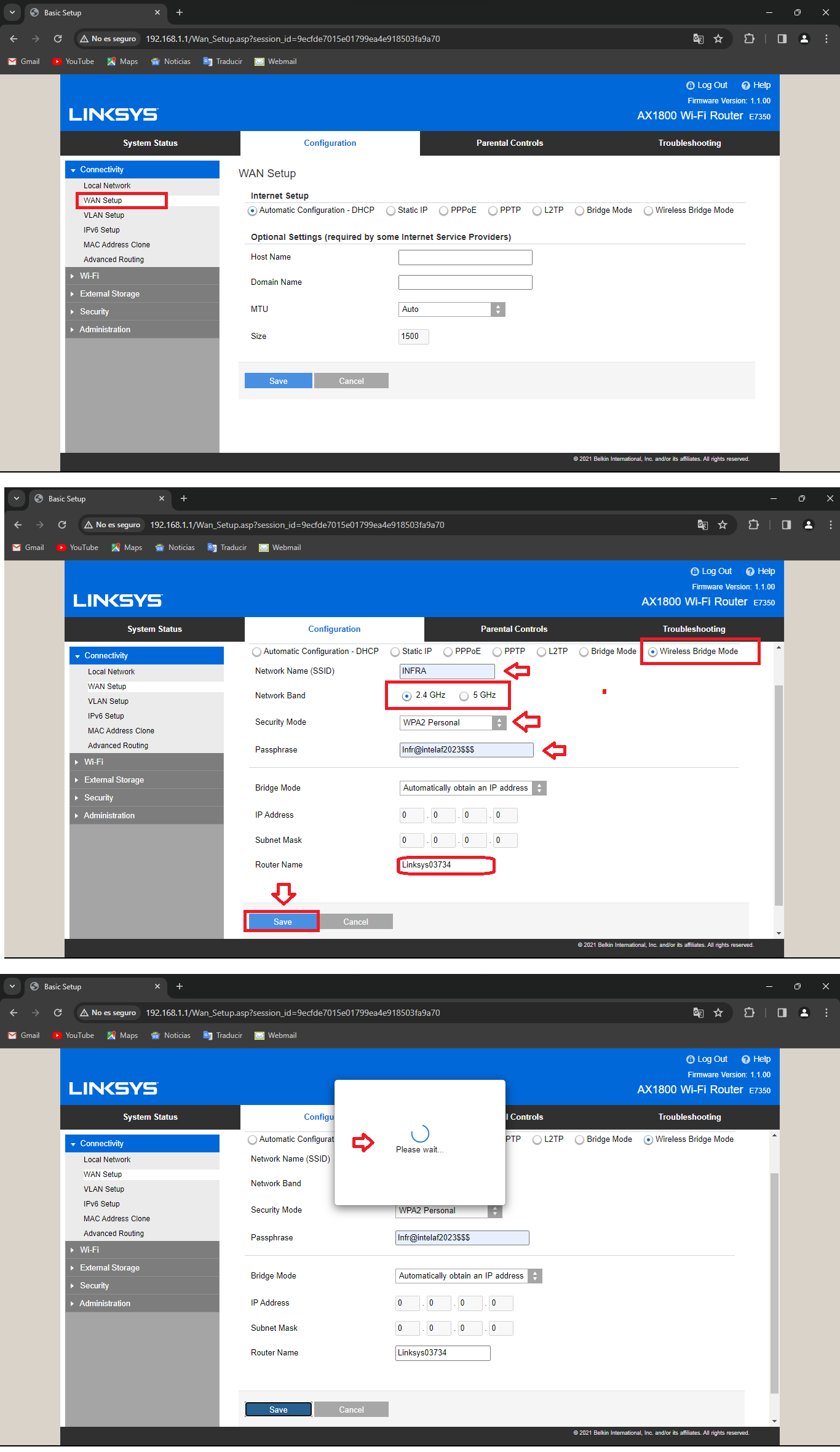 Luego en las pestañas del lado izquierdo desplegamos la pestaña connectivity, y seleccionamos wan setup, luego daremos click en la configuración wireless bridge mode y llenamos lo solicitado, nombres de la red wifi a conectar (SSID), la banda a conectarse, seleccionamos la seguridad de la red y la contraseña, luego de esta daremos en save. Esperaremos asta que se configure correctamente el router.
