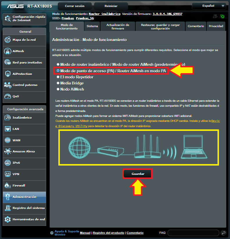 Dentro del apartado de administración, seleccionamos “Modo punto de acceso (PA)” de la lista y damos clic en “Guardar”.