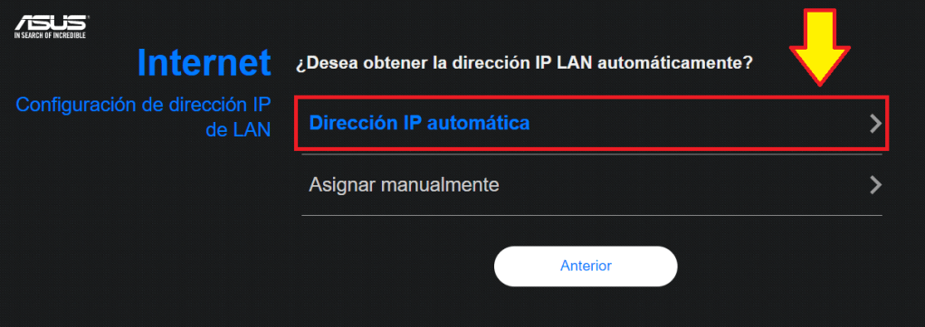 A continuación nos mostrará el apartado donde debemos seleccionar el tipo de dirección y en este ejemplo seleccionaremos “Dirección IP automática”.