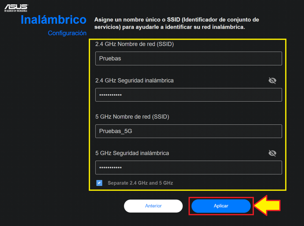 En la siguiente página debemos establecer el nombre de la red y contraseña para la nueva señal inalámbrica que nos genera el router Asus RT-AX1800S en la banda de 2.4GHz y 5GHz. Damos clic en “Aplicar”.