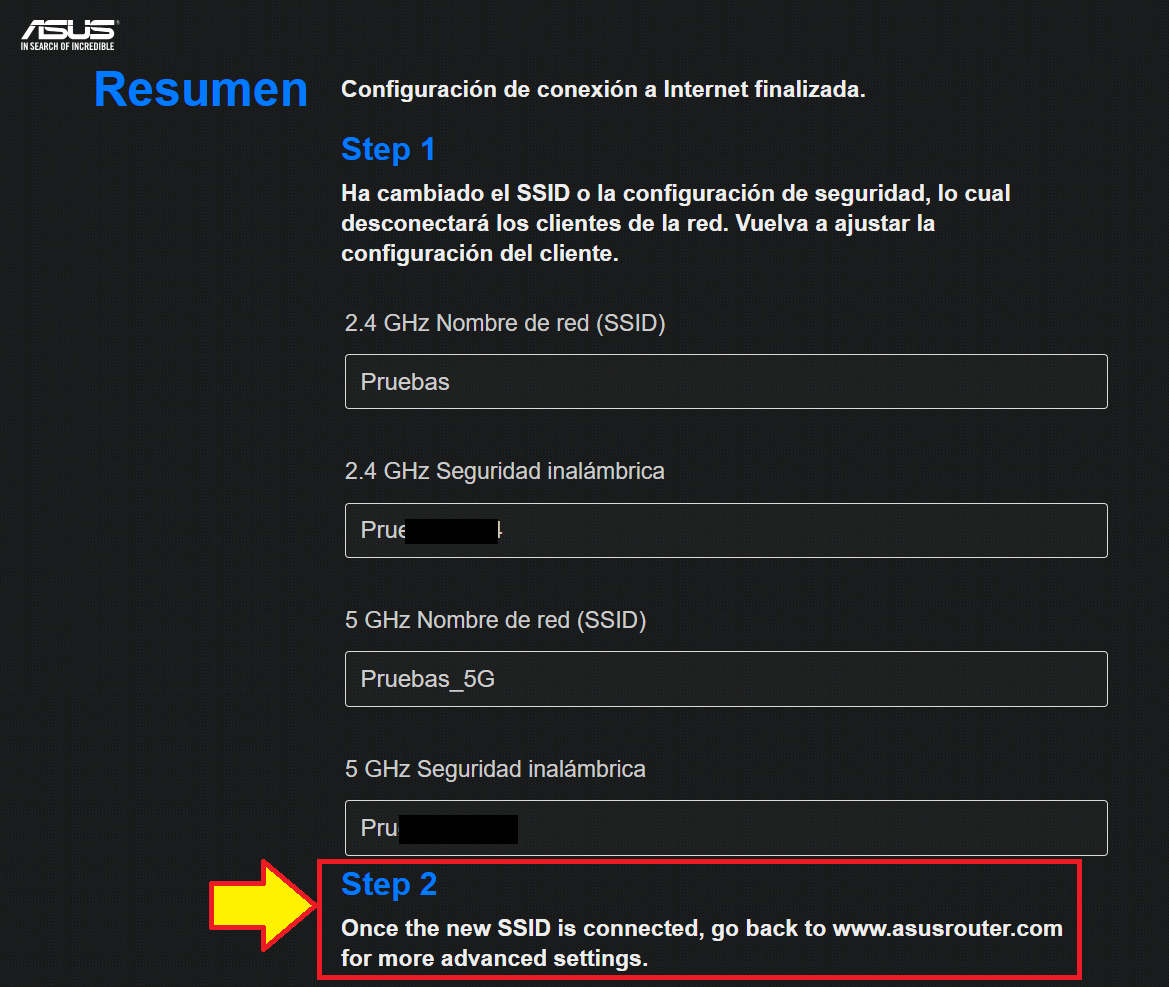 Por último solo nos indica que para poder realizar nuevas configuraciones debemos acceder a www.asusrouter.com y con esto hemos finalizado la configuración.