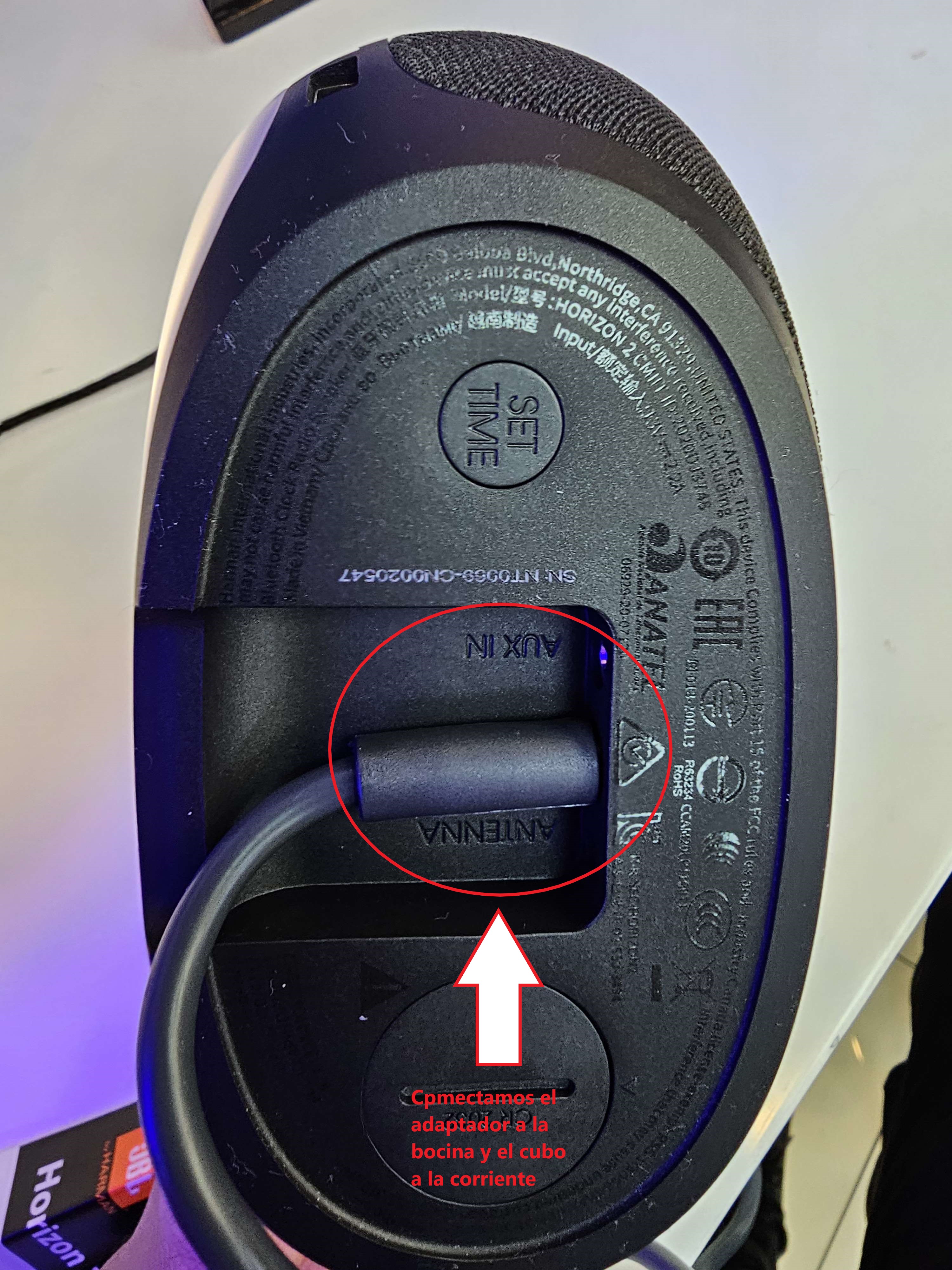 Al conectarlo, podemos verificar que nos muestra una hora y fecha pre establecida, para poder configurar esta misma, en la parte inferior de la bocina podemos apreciar que hay un botón que dice “SET TIME”, esto en español significa “Colocar tiempo”, lo presionamos durante 1 segundo.